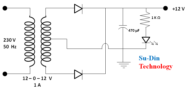 The inverter input is 12 volt DC supply. The mid-point full bridge rectifier converts 12 volt AC into 12 volt DC and filtered by the 470 µF capacitor. The advantage of using a mid-point rectifier circuit is, we will get full wave rectification using only two diodes instead of four. The LED in series with 1 kΩ resistor is just for power indication purpose. The output is connected to 12 volt battery terminals for charging. A diode is connected in series with the positive output of rectifier circuit and positive terminal of 12 volt battery to avoid continuous glowing of power indicator even when we are not charging.