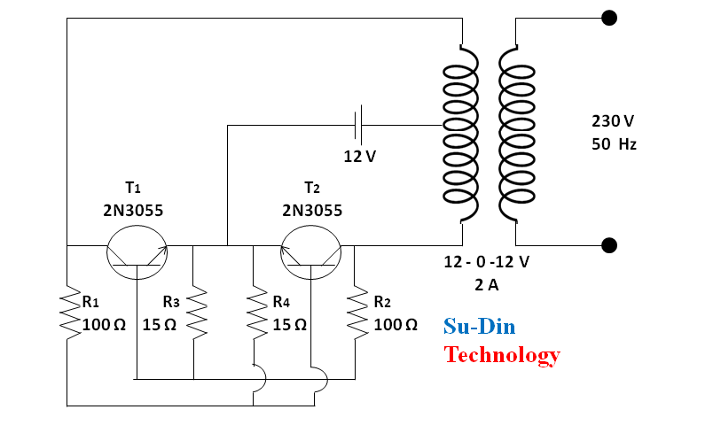 In place of 100 Ω resistor we have used two 47 Ω resistors in series and it gives 94 Ω which is close to 100 Ω. This is how in the practical world the selecting of components varies according to availability in the market in that particular instant. The transistor we have used here comes with metal body. The metal body itself is collector of the transistor. You may find difficulty in getting connection from the collector terminal by applying soldering iron. So, it will be a better option to use 1/8 size nut, bolt, washer with single core hard type copper wire. It is a saturable-core oscillator. There is no special separate feedback windings. The feedback is generated due to cross coupled connection just like in a multivibrator. It can be observed from the circuit diagram that to avoid unsymmetrical square wave production, unequal power dissipation and other malfunctions the biasing networks of the two same type transistors are balanced. The functioning of this inverter circuit is unique and different from the normal inverters which involve discrete oscillator stage for powering the transistors. It doesn’t matter the degree of matching of two halves of the circuit but practically there will be always a slight imbalance in the parameters surrounding them just like the resistors and transformer winding turns etc. Due to this reason, both the halves are not able to conduct simultaneously. Let’s assume that the transistor T1 conducts first. So it will get the biasing voltage through the lower half winding of the transformer via R2. After saturation and full conduction, the entire battery voltage is pulled through its collector to the ground. This sucks out dry any voltage through R2 to the base and it immediately stops conducting. This gives an opportunity for the transistor T2 to conduct and the cycle repeats in this way. The base Emitter resistors are used to fix a particular threshold for their conduction to break, they help to fix a base biasing reference level. The whole circuit starts to produce square wave oscillation. This 12 volt alternating quantity available at primary winding of transformer is stepped up to 230 volt AC.